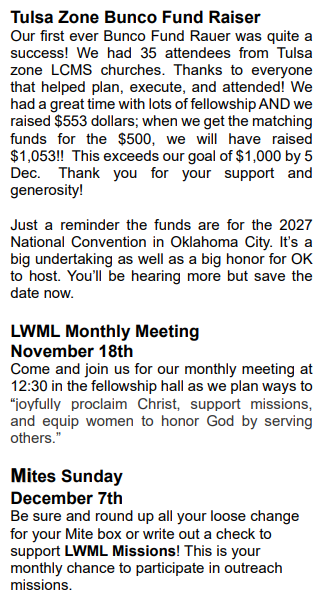 The Lutheran Women’s Missionary League (LWML) is the official women’s auxiliary of The Lutheran church—Missouri Synod.